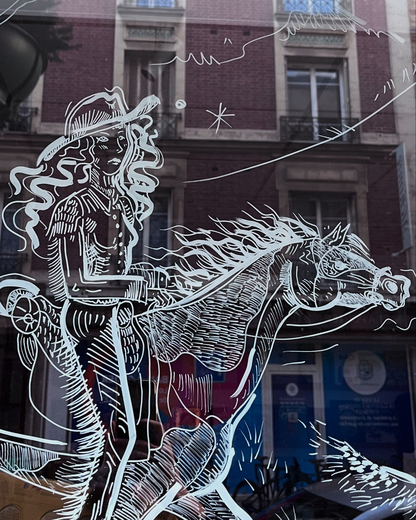 Je dessine également sur le verre ! Chaque décor est unique et imaginé en collaboration avec le commerçant. Très populaire aux périodes de Noël, il faut savoir qu'un décor peut aussi vivre le reste de l'année. Si celui-ci est peint à la peinture acrylique en extérieur, il reste très éphémère... mais s'il est réalisé au feutre Posca en intérieur, il peut résister plusieurs mois ! De quoi attirer l'œil et raconter vos histoires avec originalité.