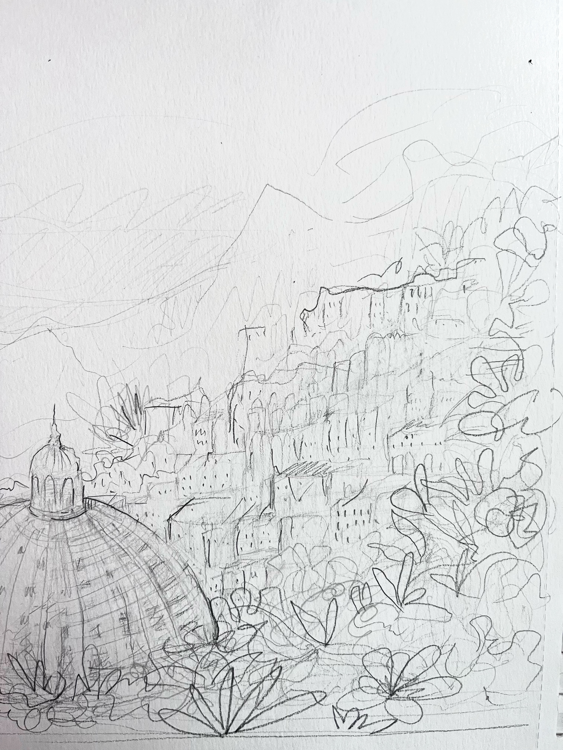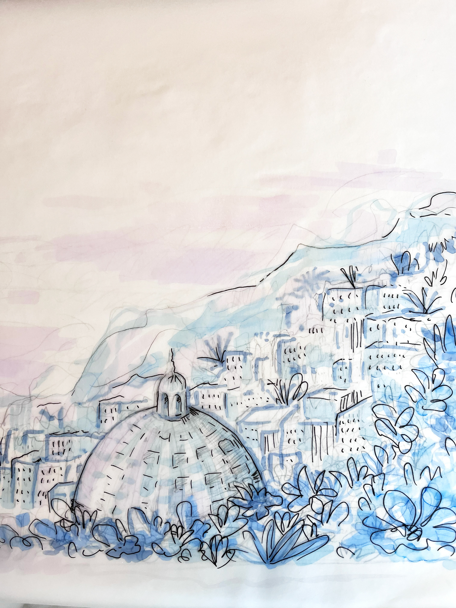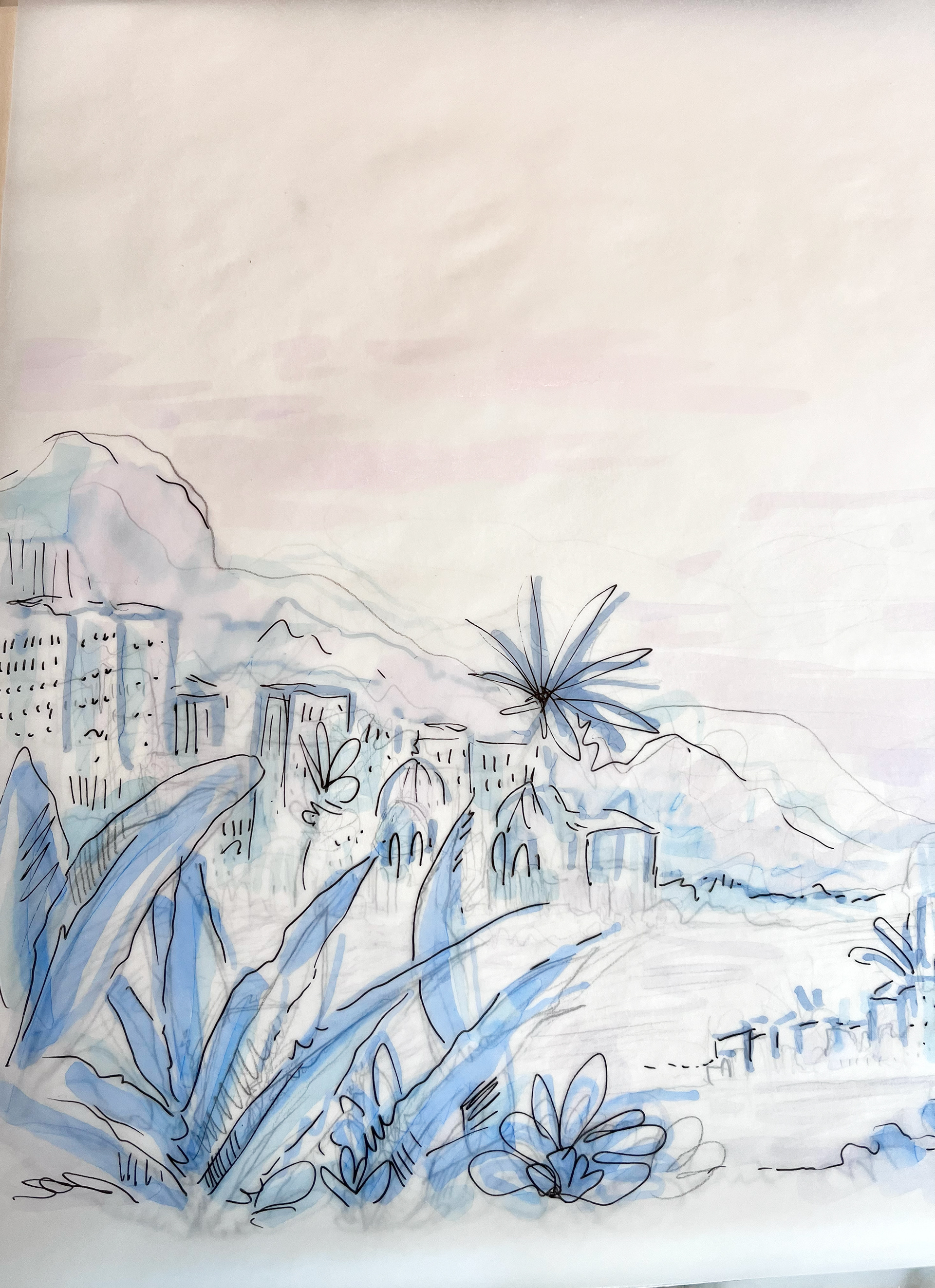 Esquisses préparatoires pour une fresque murale : mine sur papier et calque de colorisation. Ces croquis servent a valider le projet avant sa réalisation. Ils peuvent également être achetés ou reproduits, sous certaines conditions.